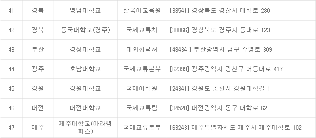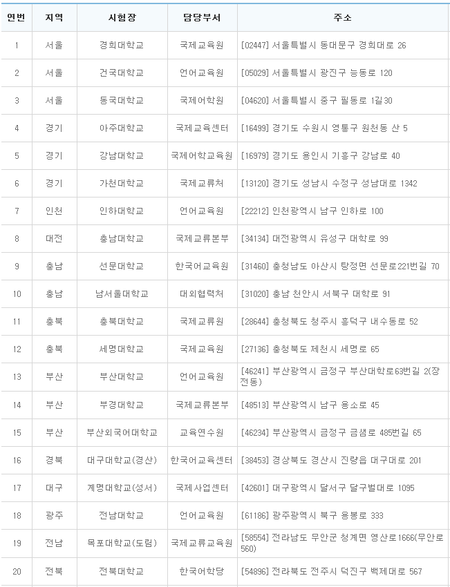 考试前要确定好考场的具体地点很重要,如果方便的话,建议考生提前一天去考场看一下,找到自己的考场位置,提前熟悉考场。下方是韩国的所有考点和具体地点,请大家参考。