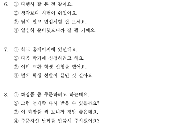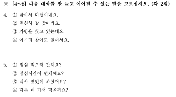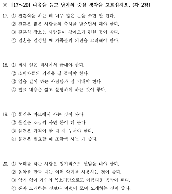 改革后的TOPIK中高级听力共50题,考试时间为60分钟,1-20题目是播放一遍,从21-50题目是播放两遍。研究每届的真题发现,TOPIK真题题目类型都是有规律可寻的,所以只要掌握了这种规律...