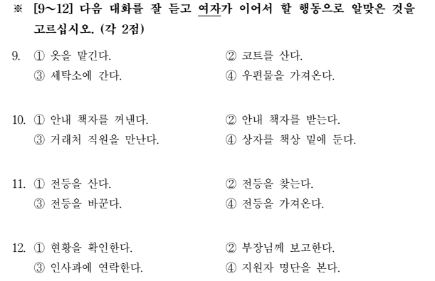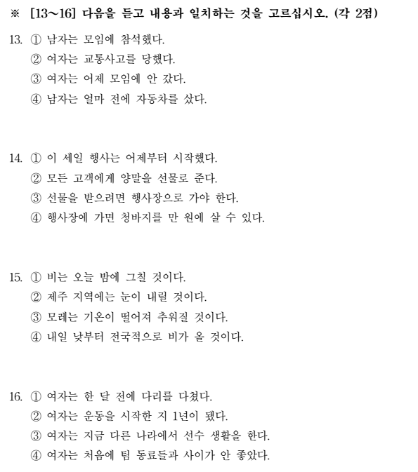 分析: 13-16题目是“把握对话的详细内容,选择与对话内容一致的”题,此类型题目有两个对话,两个独白,一般是13题与16题为对话,对话主要是个人事项或采访类节目话题,采访形式的话一般是记者问问题,对方回答,这种题目要认真听记者的问题,只要把握了记者的问题,对方的说话内容也很容易理解了;14题与15题为个人独白,独白主要是通知、讲义或是新闻。通知介绍的情况主要是公共场合、超市或公司等听到的内容,一般是提出在这些地方禁止的事项,如:..금지입니다., --(으)ㄹ 수 없습니다., --(으)면 안 됩니다.等,讲课的情况,一般是前半部分介绍讲义内容,经常出现--에 대해 알아보도록하겠다. --을 알아보게 될 겁니다. --에 관해/관하여 공부하겠습니다. 新闻的情况:报道天气预报、事件、事故等,此类型要关键听什么时间,谁,在哪里,做了什么,怎么样等关键词。