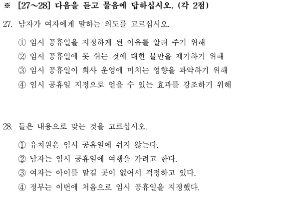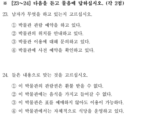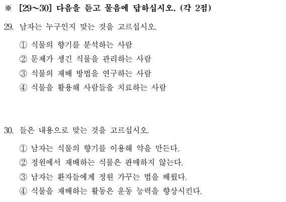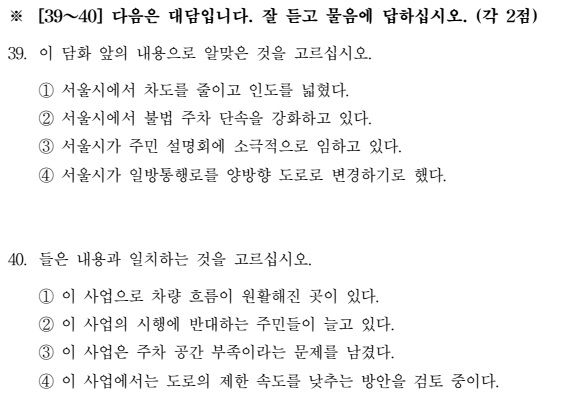 上一篇我们以52届TOPIK真题为例,讲解了听力考试的前20道题的题型,接下来继续讲解后30道题型。TOPIK的21-50听力题目听两遍,每个听力后面有两道题目,且听力内容难度开始加大,大约是中级下至高级水平。具体介绍如下: