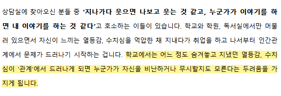 来找我商谈的几位中向我倾诉:自己每每经过他人身边,见到他们笑总觉得是在笑自己,看到他们聊天总觉得是在说自己。上学期间可以通过躲在培训班或是读书室的方式来隐藏自己的自卑感,但等到就业这些一直想避开的问题就自然随之而来。在学校的时候,他们总惧怕自己的自卑感与羞耻心被同学发现,担心自己让同学看不起或受欺负。