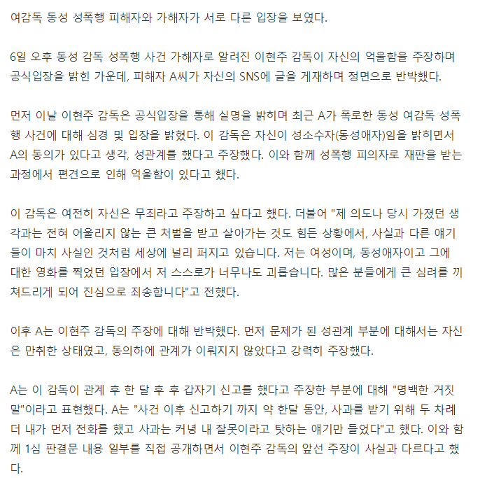 6일 오후 동성 감독 성폭행 사건 가해자로 알려진 이현주 감독이 자신의 억울함을 주장하며 공식입장을 밝힌 가운데, 피해자 A씨가 자신의 SNS에 글을 게재하며 정면으로 반박했다.