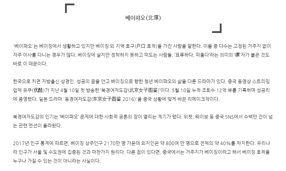 也因此韩国又多了一个新的韩文单词“베이퍄오”北漂。