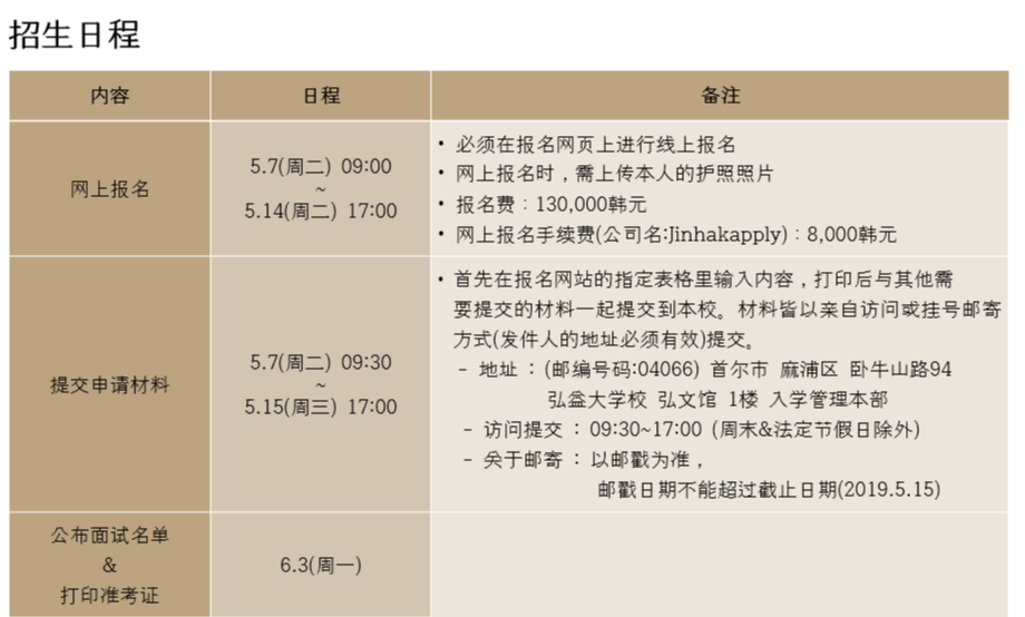 弘益大学19年9月本科招生简章