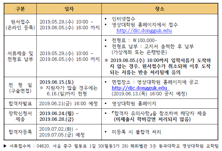 东国大学始创于1906年,至今已有百年历史。其前身是以"教育救国"为目的开办的明进学校。1945年韩国光复之后,该校实现全面飞速发展,现设有13个单科大学和11个研究生院。其中,人文类和艺术类专业一直稳居韩国各高校同类别专业前茅。东国大学尤其以新闻传媒,演艺界和文化界名人辈出的戏剧电影系和影像研究生院而闻名,该院系目前是全韩国最高的戏剧表演和影视艺术研究学府之一。作为综合性大学影视传媒教育的代表,东国大学目前拥有全韩国最先进的影视教学与制作中心——忠武路影像中心,并且每年会定期举办首尔忠武路国际电影节以挖掘培养电影新人。