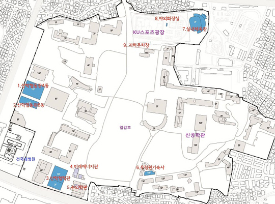 新建的9个建筑物分别是:建国大学产学连动馆,产学协力馆,宿舍,体育馆等7栋楼,以及需要增建的未来能源馆和兽医学馆。