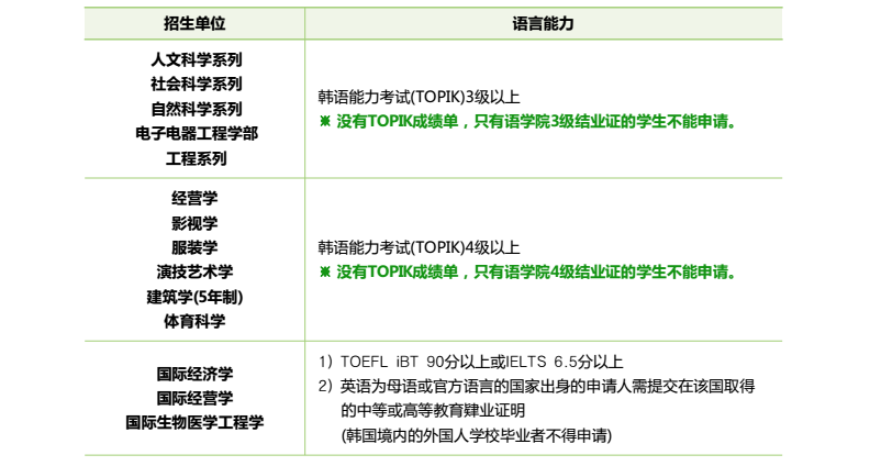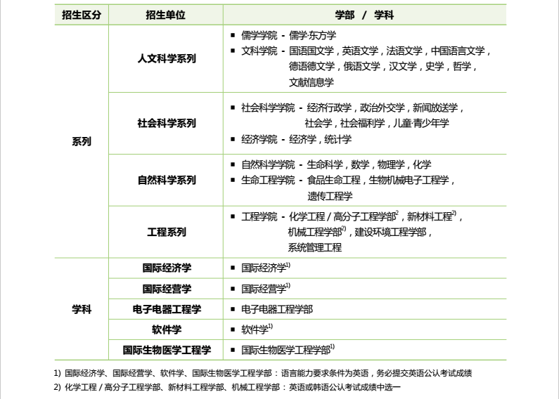 -学校特色:历史悠久的名校,有着600多年的建校历史,全韩综合大学排名连续四年第一。学校背靠韩国第一大大财团-三星集团, 财政实力雄厚,科研资金极为丰富。本科根据GPA提供10%、20%、35%奖学金,研究生提供50%奖学金。