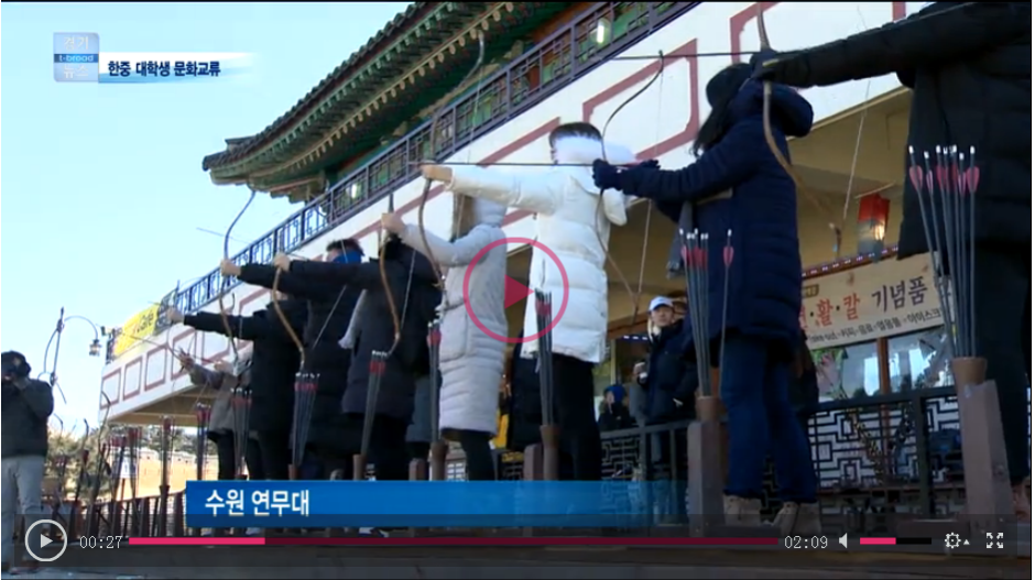 水原市是韩国 京畿道的首府城市,是该道的政治、经济、文化、交通的中心。来自中国北京外国语学院的学生在水源的演武台体验了韩国传统射箭文化。记者采访了中国学生,中国学生表示“虽然是第一次来韩国但是韩国人对我们非常热情非常友好,带我们在水源各个地方采访参观,学习到了很多韩国文化”“希望今后能来这里继续学习韩国文化”。