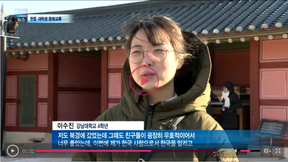中韩文化交流项目从2005年开始至今,每年都会让中韩大学的学生到互相道对方的国家体验当地的文化生活。记者采访了一位负责接待中国大学生的韩国大学生,学生表示“我之前去过中国交流学习,当时中国的朋友们对我非常的热情友好,这次有机会接待中国大学生并且向他们宣传韩国文化感到非常开心”