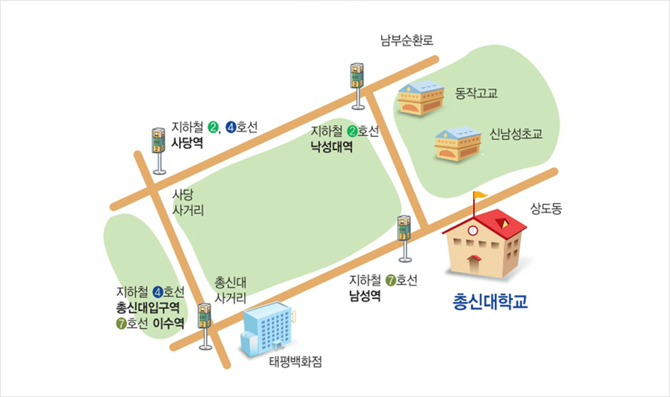 4号线::<总神大学(이수)站>下车 7号线换乘 <남성站>下车 (3号出口) → 步行 8分